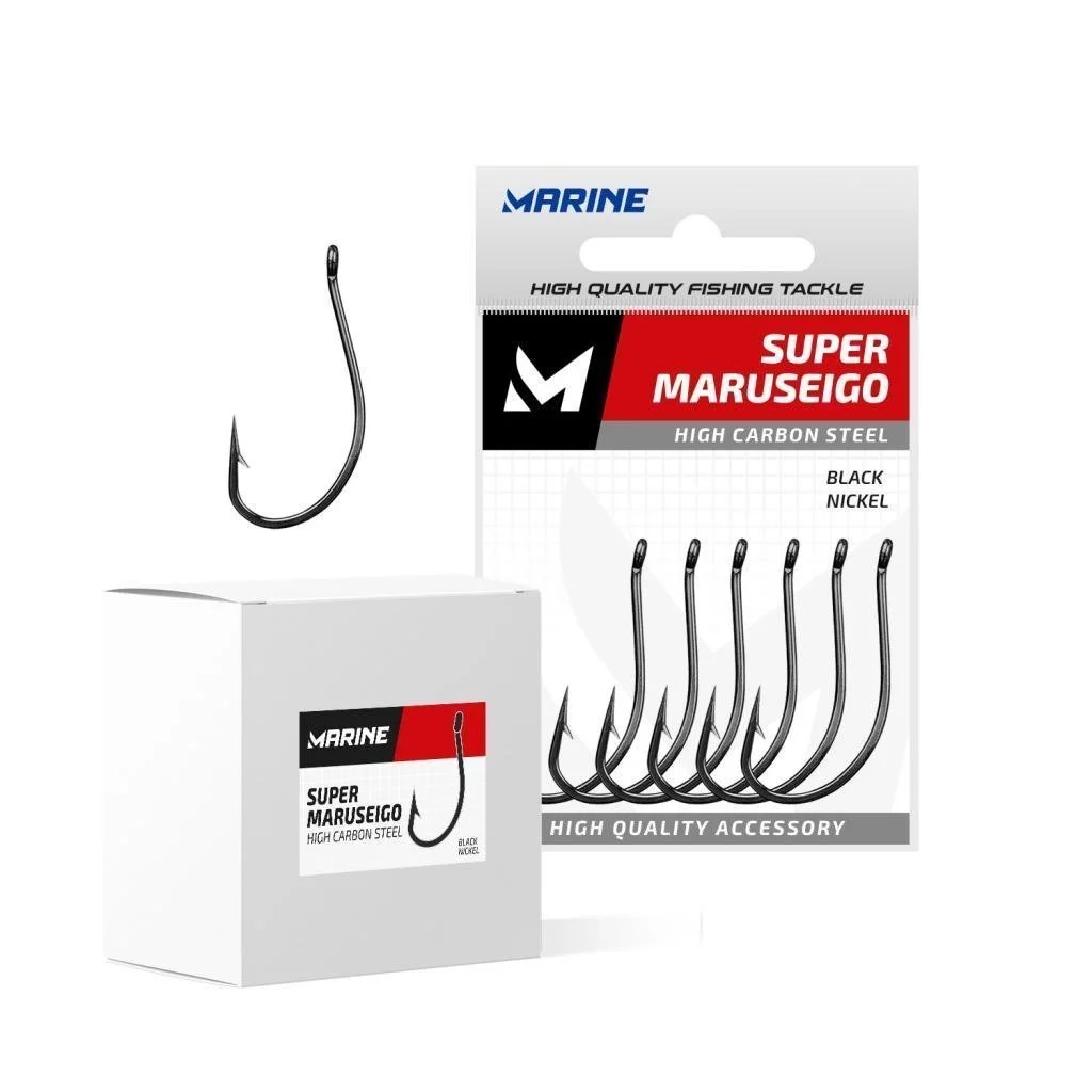 Anzol da marca Marine, modelo Maruseigo, ou seja, mais resistente, com acabamento em blackniquel, fabricado em aço carbono de alta resistência, possui um formato muito apreciado pelos pescadores.